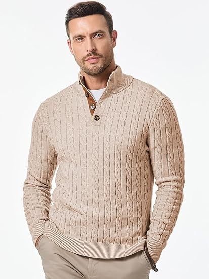 Unique Design: Casual sweater for men features button-up neck, stand collar, chunky warm, basic simple design. The collar and elbows are accented with suede patches, and it includes high-quality button closures.